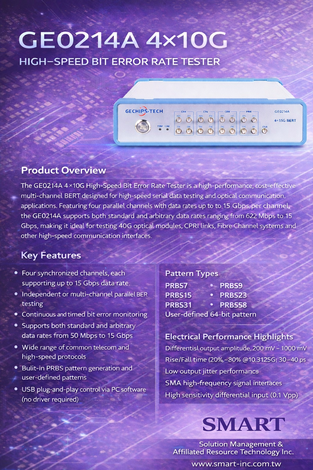 GE0214A 為一款高效能、多通道高速誤碼測試儀(Bit Error Rate Tester, BERT),由 GECHIPS-TECH 推出,具備 4 通道同步輸出設計,單通道最高可達 15Gbps,專為高速光通訊模組、SerDes 連結與資料中心高速傳輸測試所打造。